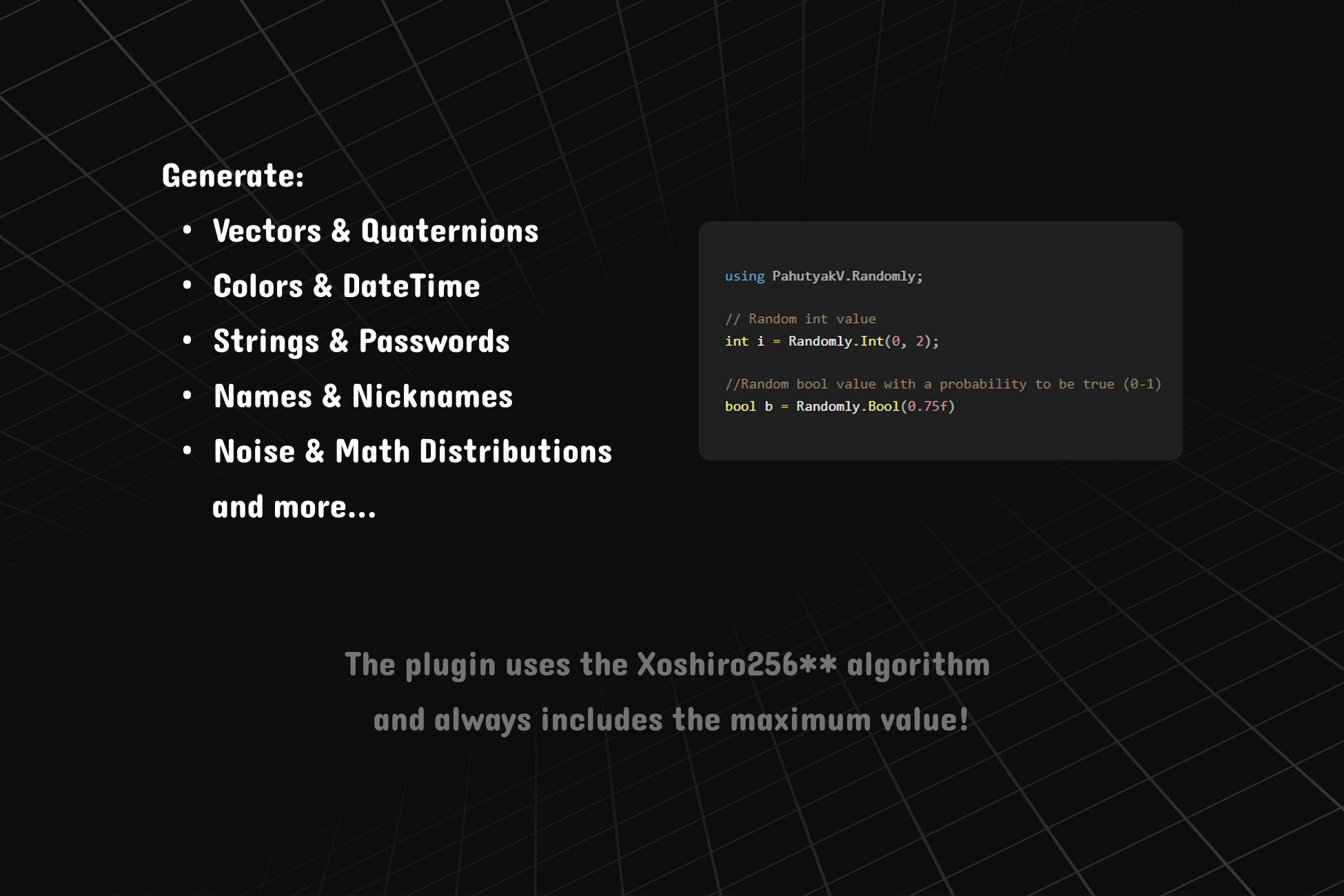 Randomly is a comprehensive and easy-to-use random data generation library for Unity. Designed for developers and designers, it allows you to generate: